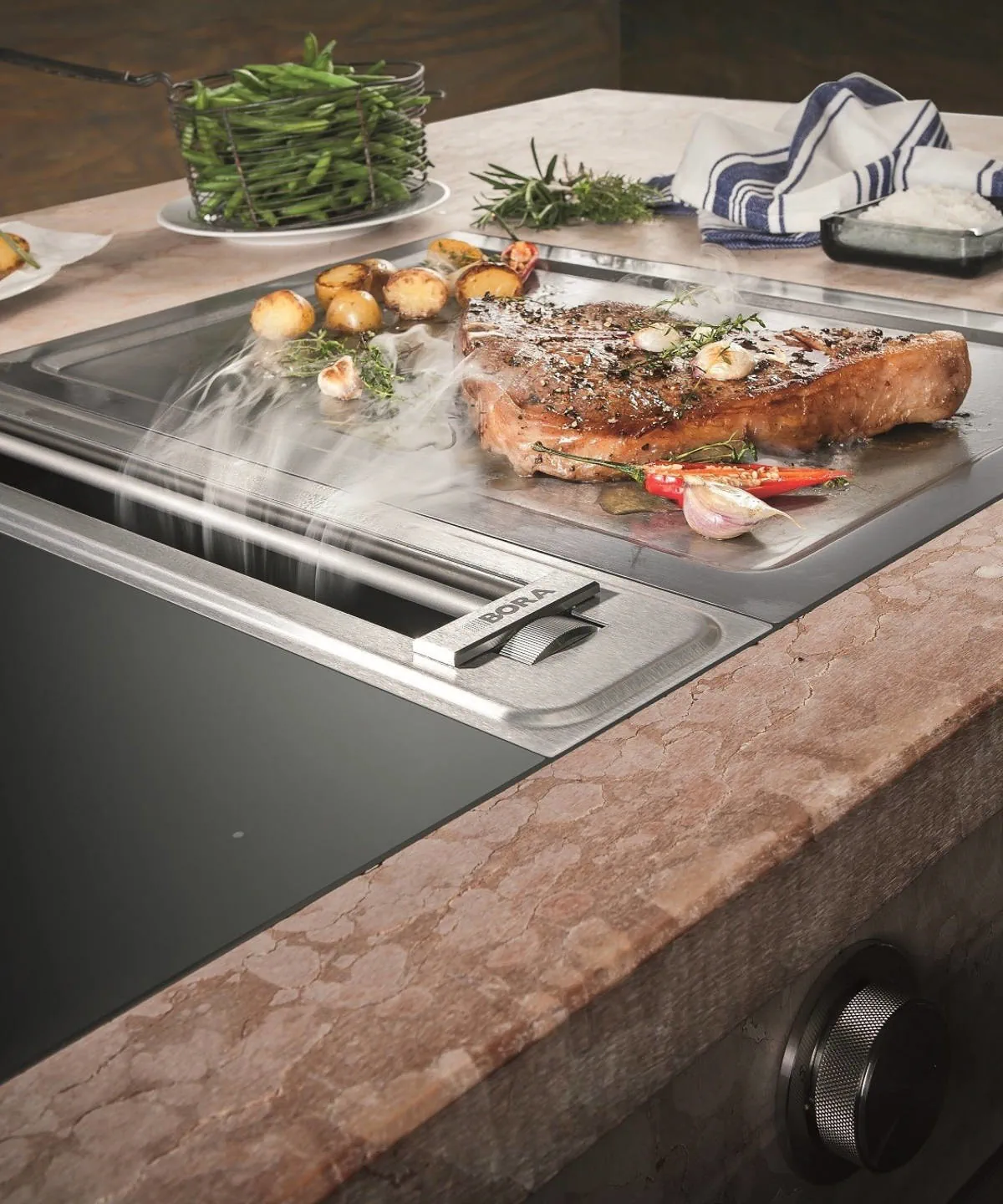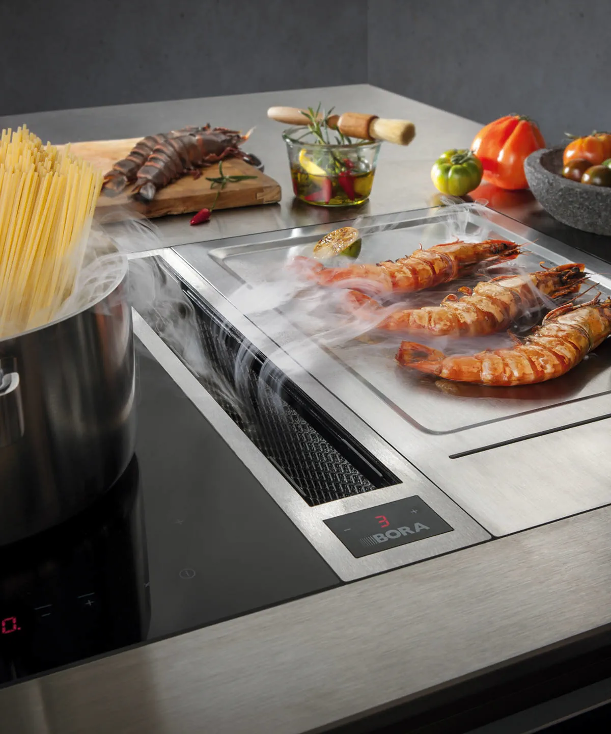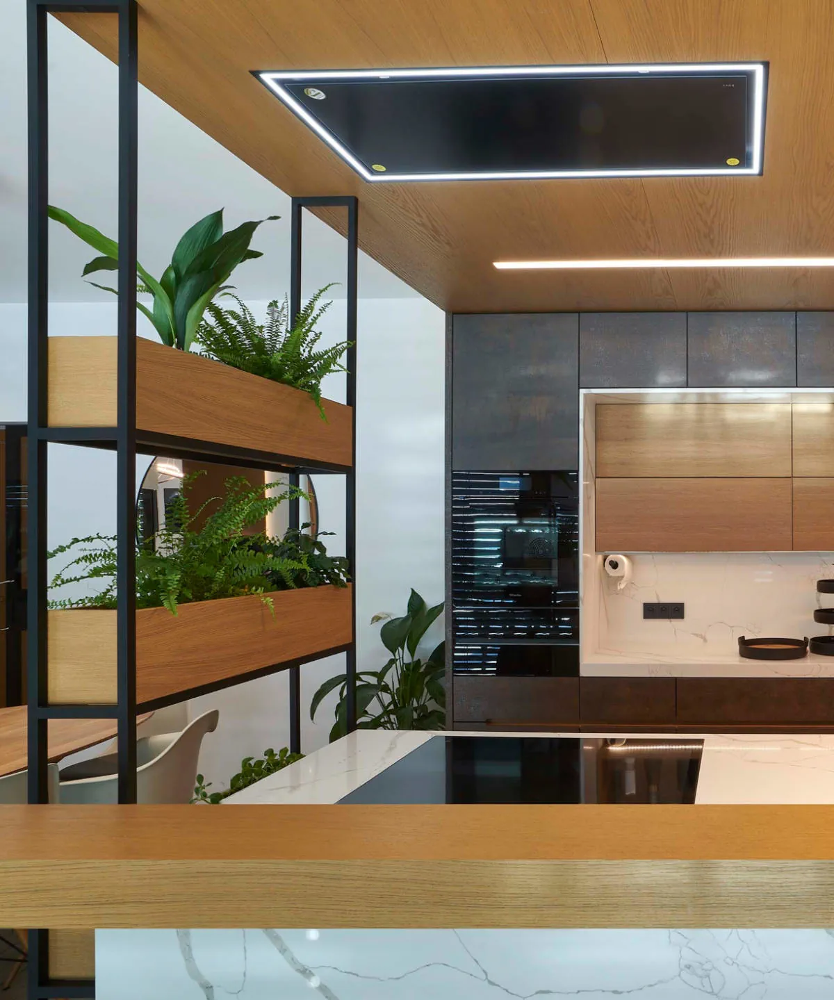 Digestoř je často prvkem, který designově kazí celkovou atraktivitu kuchyně, zvláště v moderních minimalistických interiérech. I proto často používáme různé typy skrytých digestoří:stropní, štěrbinové u varné desky, výsuvné z pracovní desky či skryté v horních skříňkách.