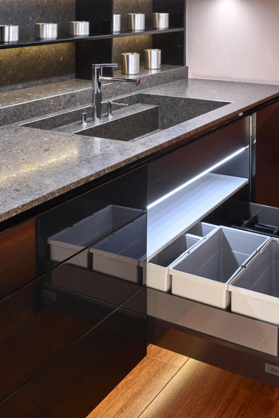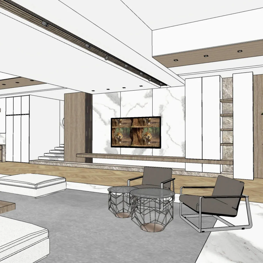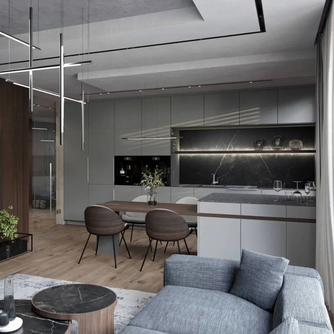 Naším standardem je v každém projektu výroba nábytku, obkladů stěn a integrovaných bezfalcových dveří, vždy včetně montáže. Komplexní zařízení bytového prostoru nicméně vyžaduje nejen řešení nábytku, nýbrž často také zajištění stavebních prací, v některých případech pak dokonce i organizačně a odborně velmi náročné zapojení celé řady dalších specializovaných oborů jako jsou řešení akustiky, rekuperace versus chlazení, nebo třeba osvětlení tvořící různé atmosféry.